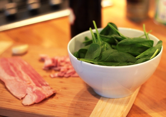 Podgrzewamy oliwę na patelni. Dodajemy czosnek i smażymy przez 1- 2 minuty, do czasu kiedy jego aromat przedostanie się do oliwy. Wyrzucamy czosnek i zmniejszamy ogień. Dodajemy śmietanę i ser pokrojony na mniejsze kawałki. Zwiększamy ogień i mieszamy do czasu aż ser się roztopi. Dodajemy szpinak i mieszamy delikatnie, aż zrobi się miękki. Zdejmujemy sos z ognia. Doprawiamy go świeżo mielonym pieprzem i startą gałką muszkatołową.
